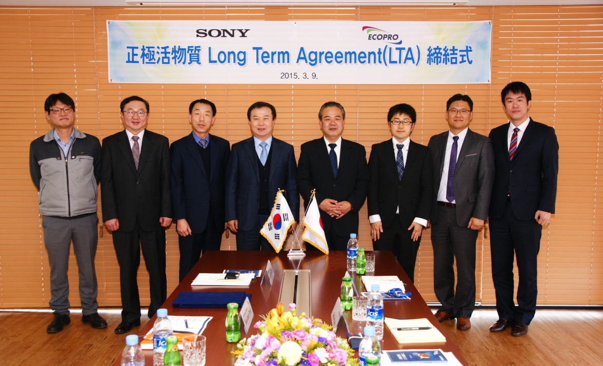 [사진1] 2015년 3월, 이동채 전 에코프로 회장(왼쪽에서 네 번째)이하 에코프로 임직원이 소니와의 장기공급 계약 체결식에서 기념촬영을 하고 있다.